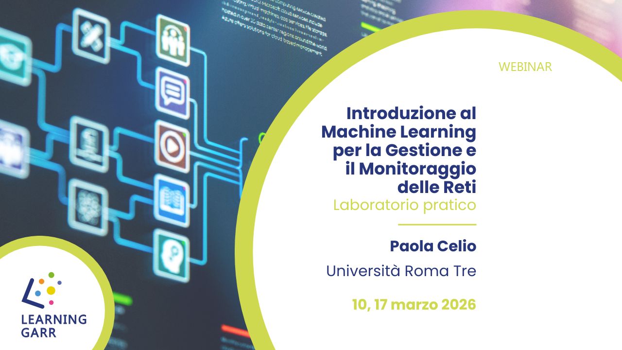GARR organizza corsi su tematiche legate alla gestione e all’uso della rete e dei suoi servizi e applicativi evoluti: dalla gestione della rete alla sicurezza, dal monitoring alle identità digitali, dalle risorse educative aperte (OER) all'utilizzo dei servizi avanzati. Queste attività sono pensate per favorire l'aggiornamento, la conoscenza e lo scambio di informazioni sulle attività di ricerca e di sviluppo delle nuove tecnologie di rete e servizi.